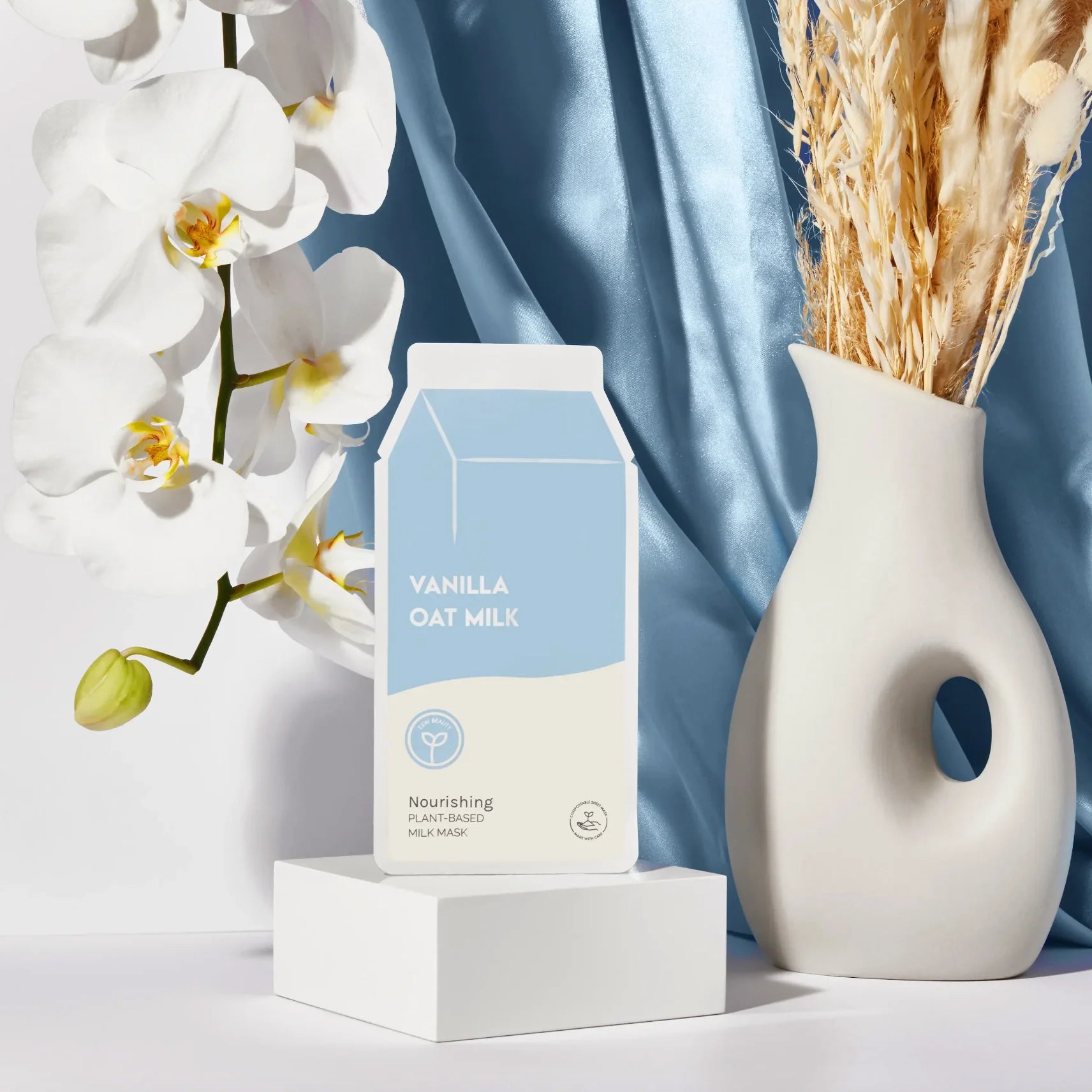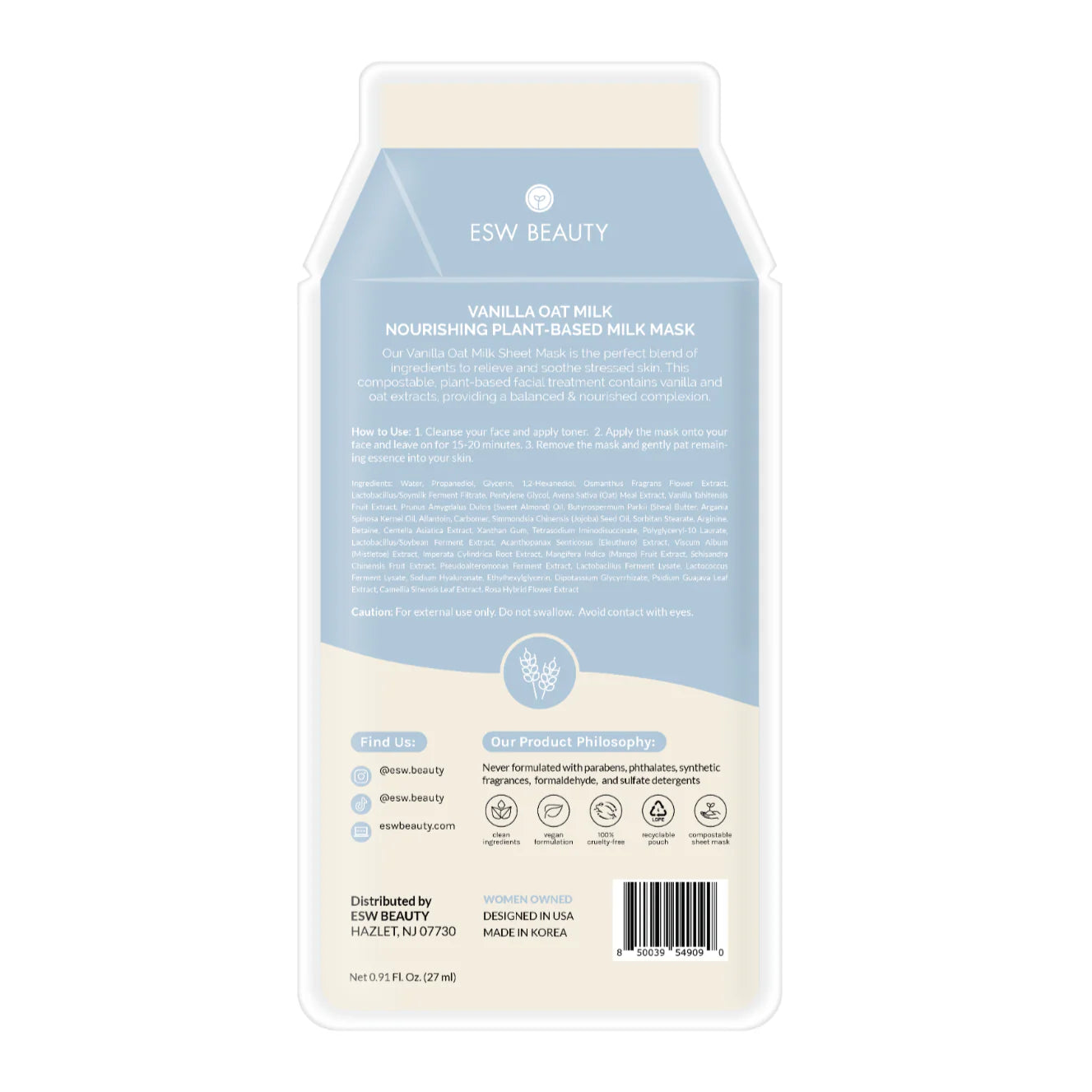 Our Vanilla Oat Milk Sheet Mask is the perfect blend of ingredients to relieve and soothe stressed skin. This compostable, plant-based facial treatment contains vanilla and oat extracts, providing a balanced & nourished complexion.