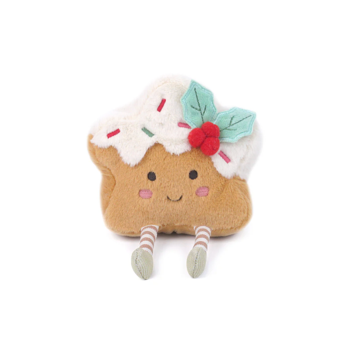 Our Holiday Frosted Star Cookie is here, sugar-free but full of sweetness! This Star Cookie plush is the ultimate holiday treat that won't crumble.With its fluffy faux fur 'frosting' topped with sprinkles, and an adorable holly berry, it's as festive as can be. Rosy cheeks and a happy smile bring instant holiday cheer, while its dangling striped legs add a whimsical touch. Perfect for decorating, cuddling, or a caring gift for the star in your life this Holiday season.